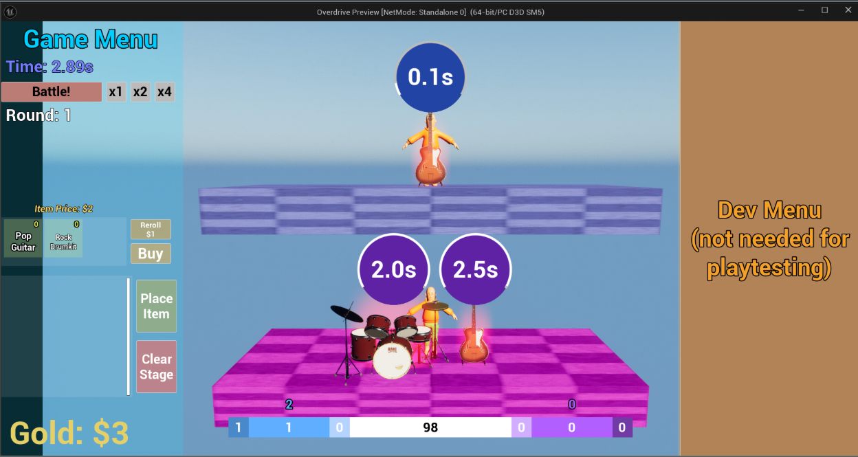 Overdrive is a strategic autobattler where players assemble a band and compete in automated musical matchups driven by music-genre-based synergies. Instead of traditional combat, players interact through musical, pacifistic performances, with gameplay centered on item positioning, team composition, and optimizing music-genre effects.